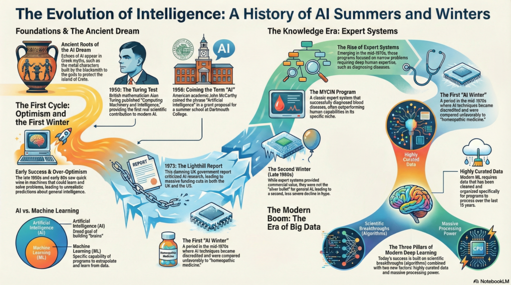 In the beginning, researchers were very optimistic. They built machines that could learn and solve simple problems, leading to bold predictions that intelligent machines would arrive very soon. When these predictions failed to come true by the early 1970s, there was a harsh backlash. A famous report in the UK called the Lighthill Report criticized AI research. As a result, funding was slashed in the UK and the US, leading to a period known as the AI Winter. During this time, AI research had a pretty bad reputation.